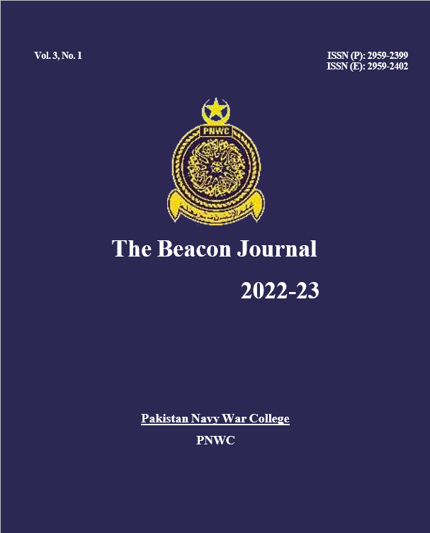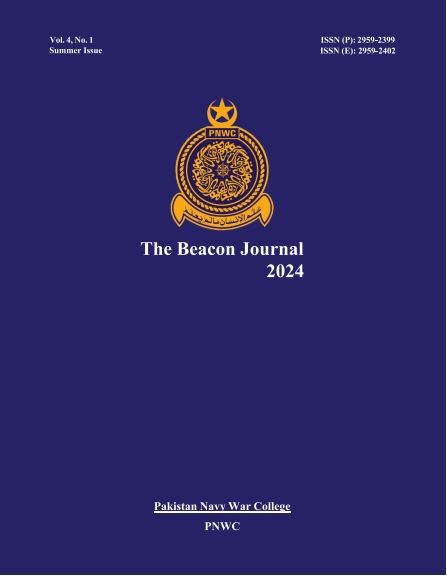 Vol. 4 No. 2 (2024)The Beacon is an annual publication of Pakistan Navy War College, which a premier institute and the highest seat of learning in Pakistan Navy. The scope of the journal includes key traditional as well as non-traditional security issues confronting regional and global environment. It primarily focuses on maritime security, blue economy, international security, peace and conflict studies, and other contemporary geo-political and strategic issues. The main objective of The Beacon Journal is to promote high-standard scholarly and policy-oriented research in the aforementioned areas of study. Hence, under the guidance of an expert Advisory Board, the Beacon Journal serves as a trendsetter in academic world to advance maritime and strategic thinking in Pakistan.